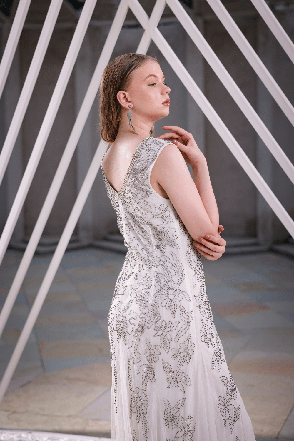 An ethereal ivory gown adorned with delicate all-over beadwork in soft floral patterns. The sleeveless silhouette with a bateau neckline lends a refined grace, while the flowing floor-length skirt in lightweight net fabric creates a fluid, dreamy movement. Subtle shimmer from the hand-embellished detailing enhances its timeless appeal, making it a perfect choice for evening galas, weddings, or any formal occasion.