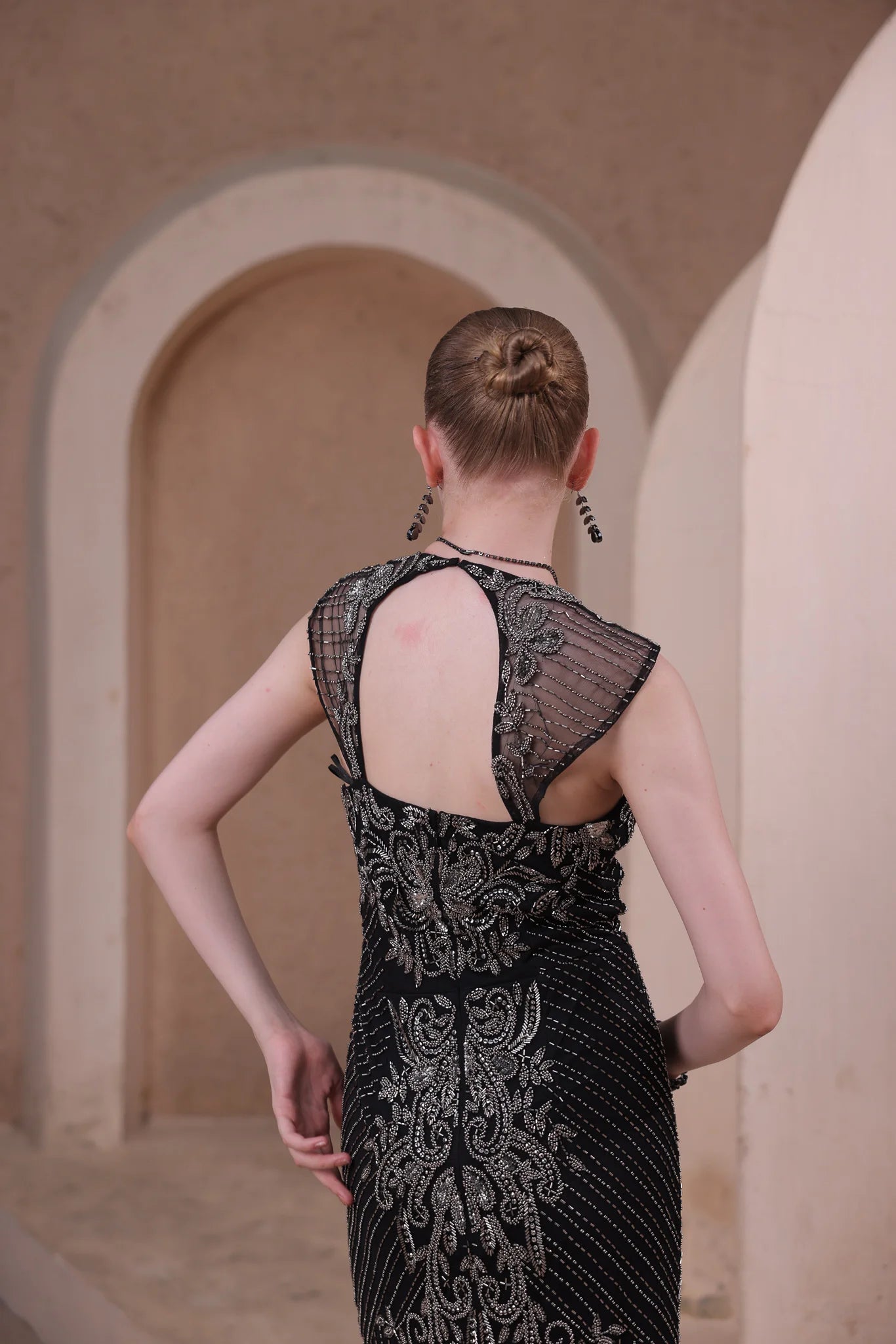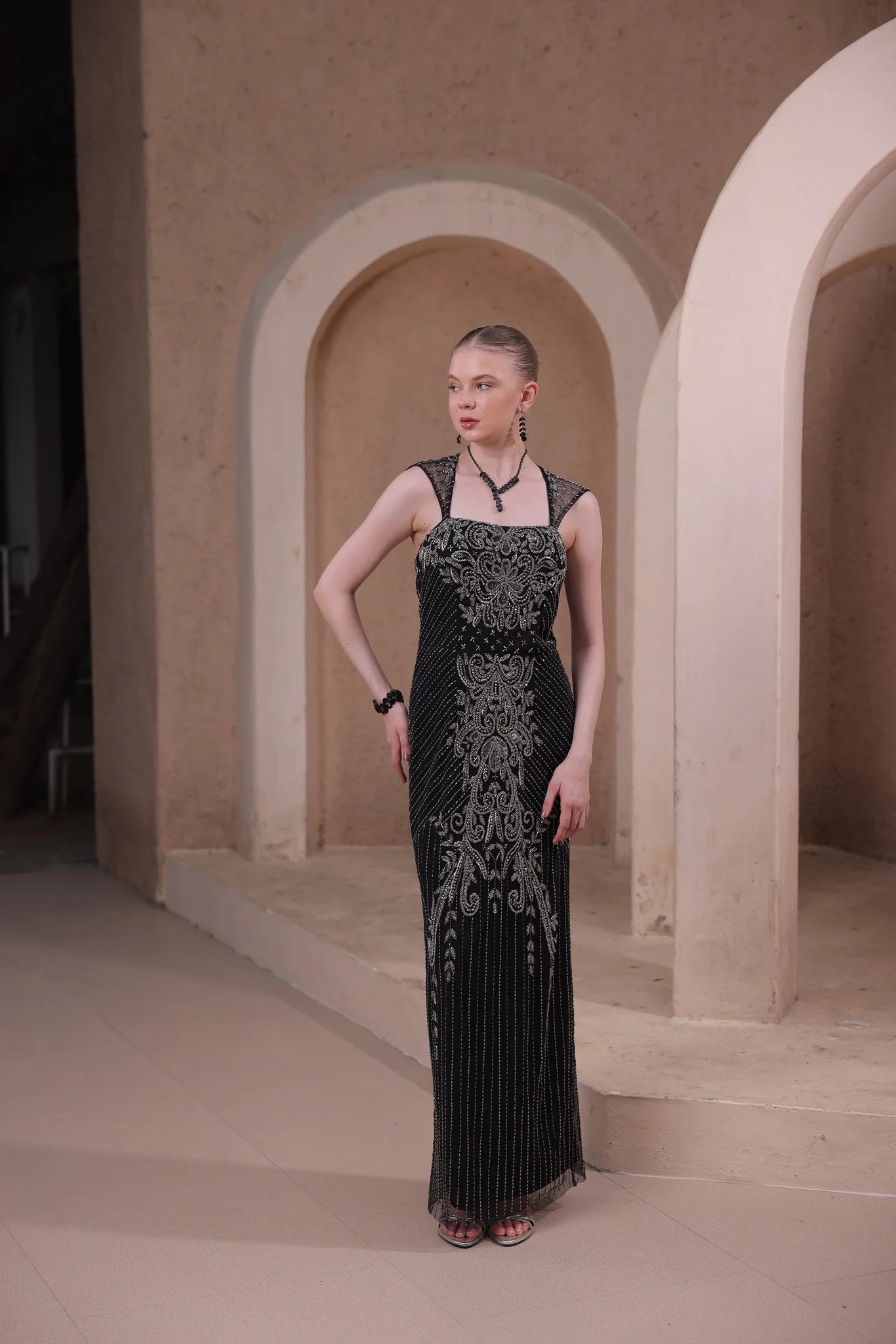 A masterpiece in black and mercury, this floor-length gown captures the essence of timeless sophistication. The base is crafted in delicate tulle, fully hand-embellished with intricate mercury beadwork that creates baroque-inspired motifs across the bodice and hips. These ornate patterns seamlessly blend into vertical bead lines that flow down the length of the gown, elongating the silhouette and adding a statuesque finish.