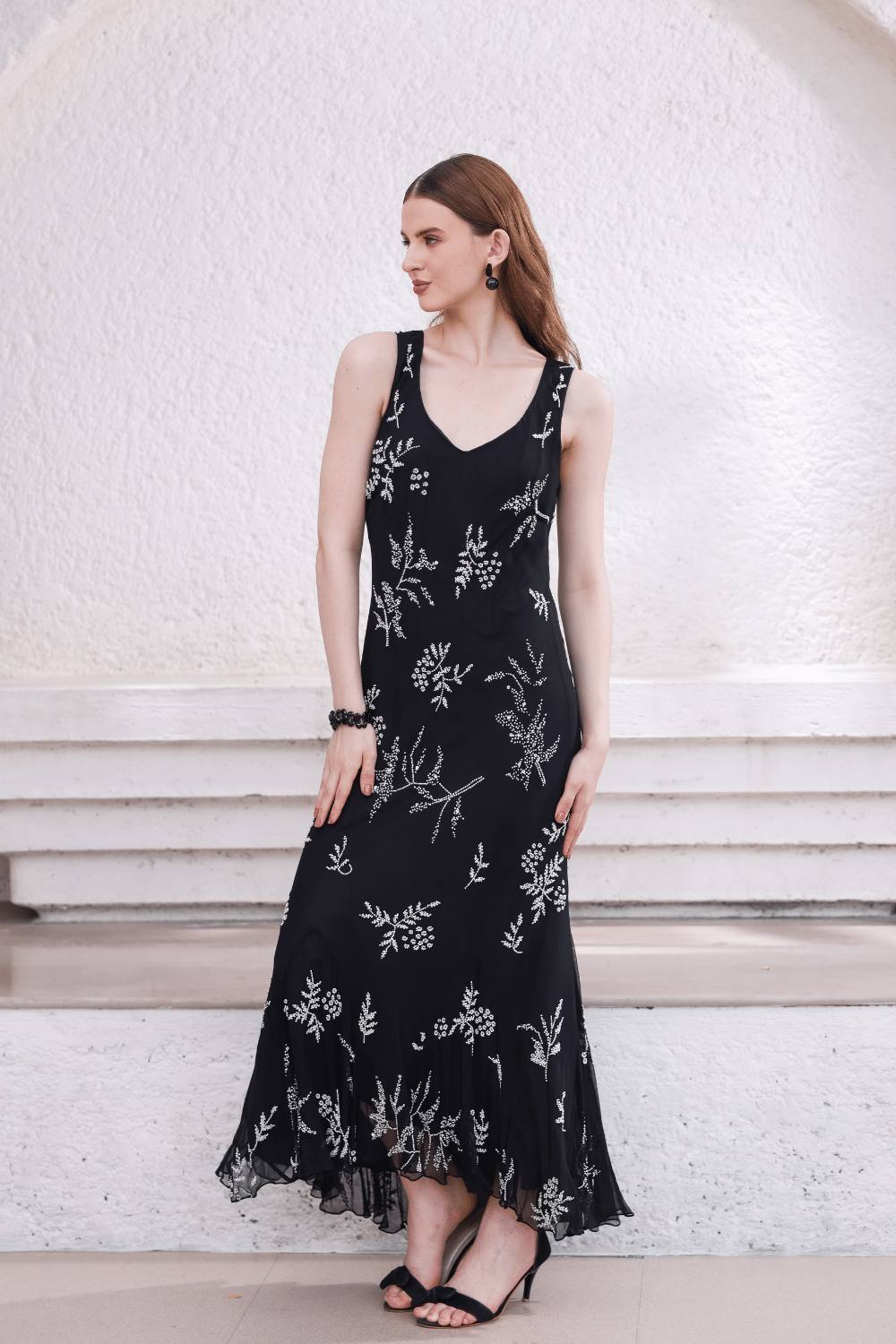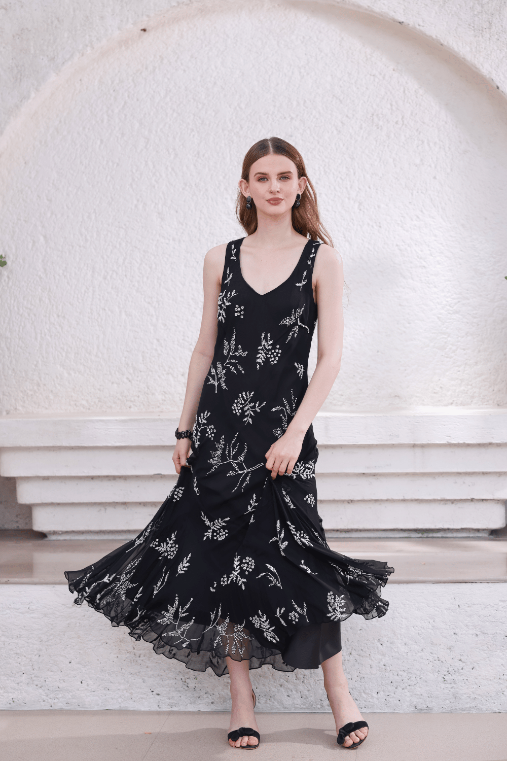 A timeless black bias dress brought to life with delicate white hand-beaded botanical motifs. The sleeveless silhouette and soft neckline flow into a fluid hemline, creating graceful movement with every step. Minimal yet refined, this dress is a versatile choice for cocktail gatherings, dinners, and festive evenings.