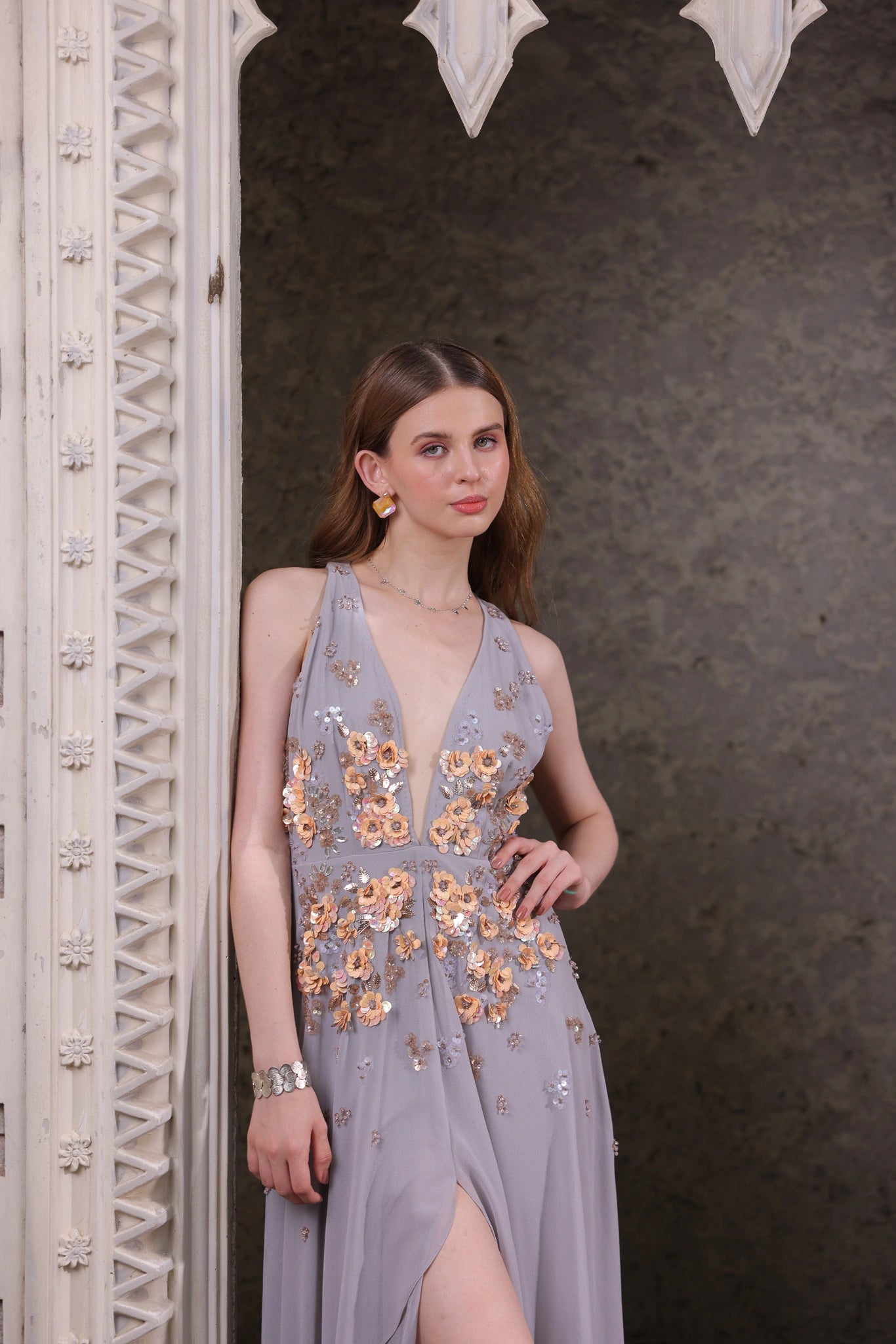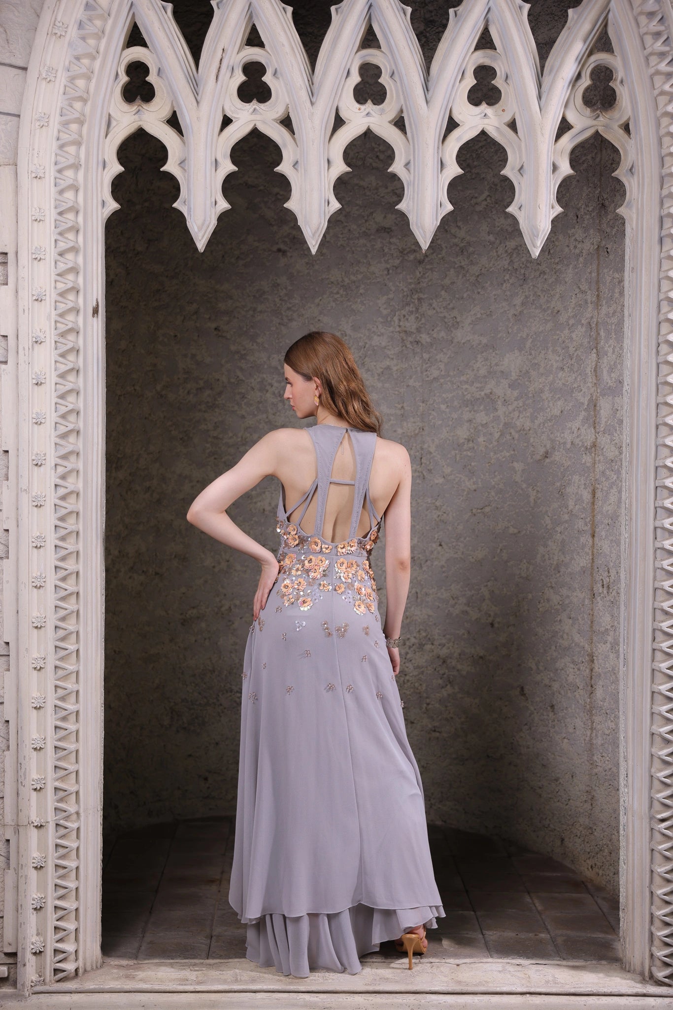 A timeless piece in a refined grey shade, this gown beautifully balances romance with modernity. The bodice is richly detailed with hand-beaded floral motifs in soft pastel accents, creating an exquisite textured effect. The layered high-low hemline flows gracefully with every step, while the strappy back adds a contemporary touch to its otherwise classic silhouette.
