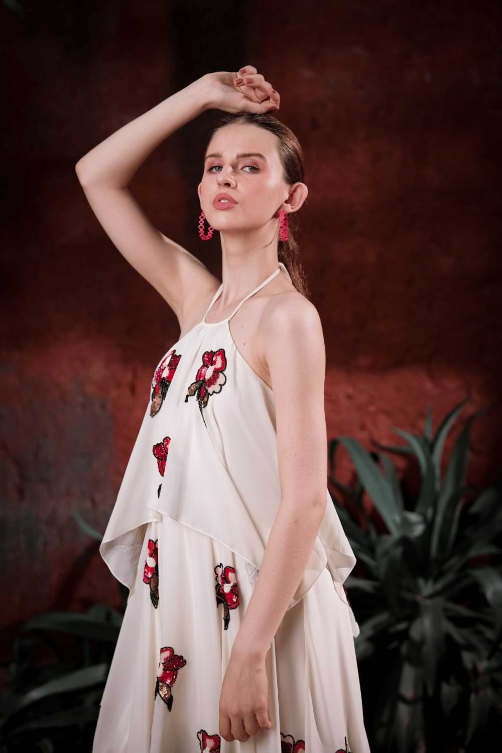 A breezy halter dress in ivory, crafted in lightweight georgette. The silhouette features layered asymmetric panels that cascade effortlessly, creating graceful movement. Hand-embroidered floral motifs in vibrant red, pink, and gold sequins are scattered across the front and back, adding bold pops of color to the soft base. The halter neckline ties at the back, offering an elegant detail while keeping the look playful and modern.
