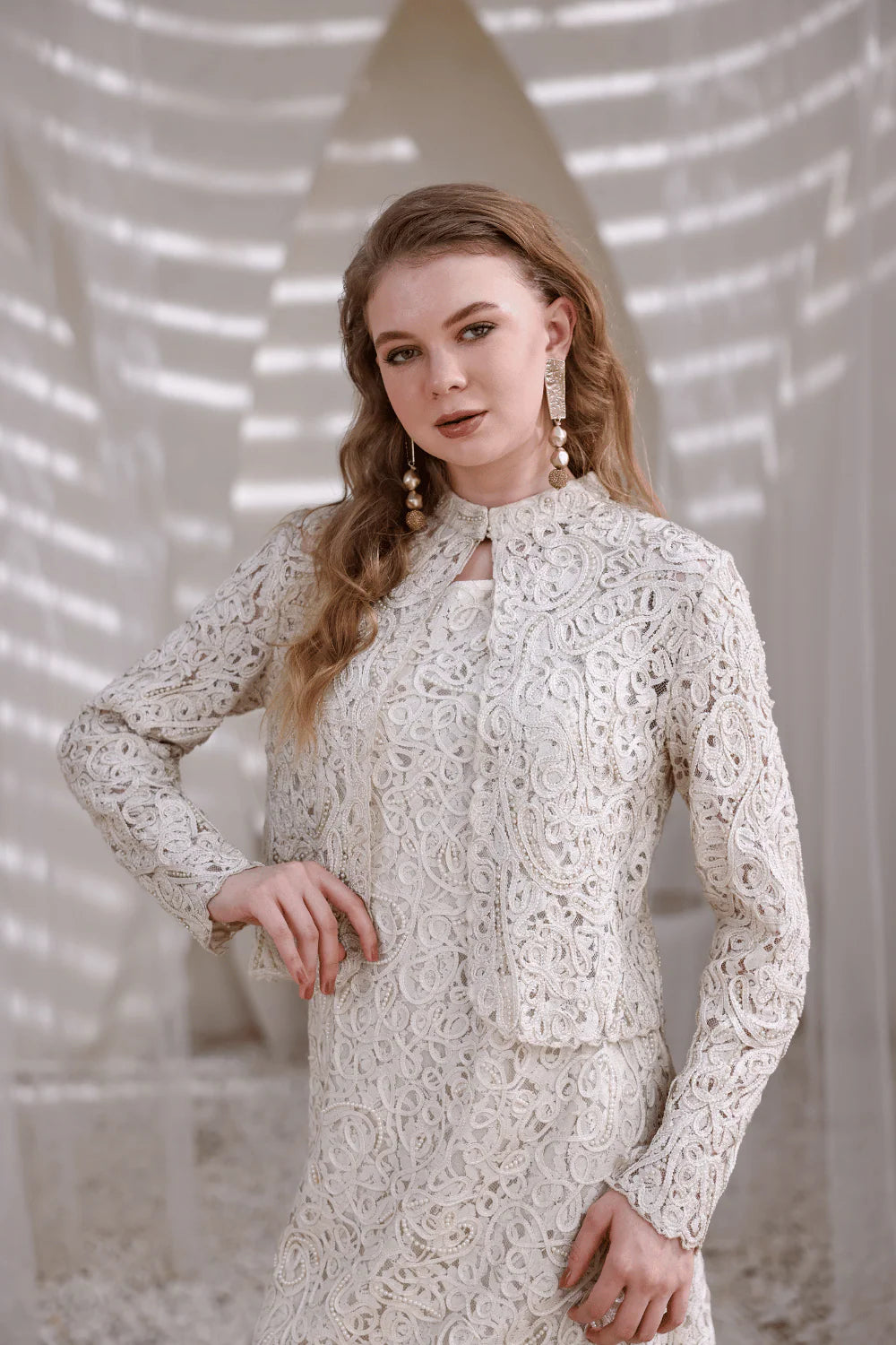 A modern monochrome co-ord in soft tweed, finished with delicate black lace along the neckline, sleeves, and waist. The cropped jacket adds structure, while the straight-leg trousers keep the look refined and elongated. Balanced, polished, and subtly feminine, it’s a versatile set perfect for work meetings, chic lunches, or evenings when you want to look effortlessly put together.