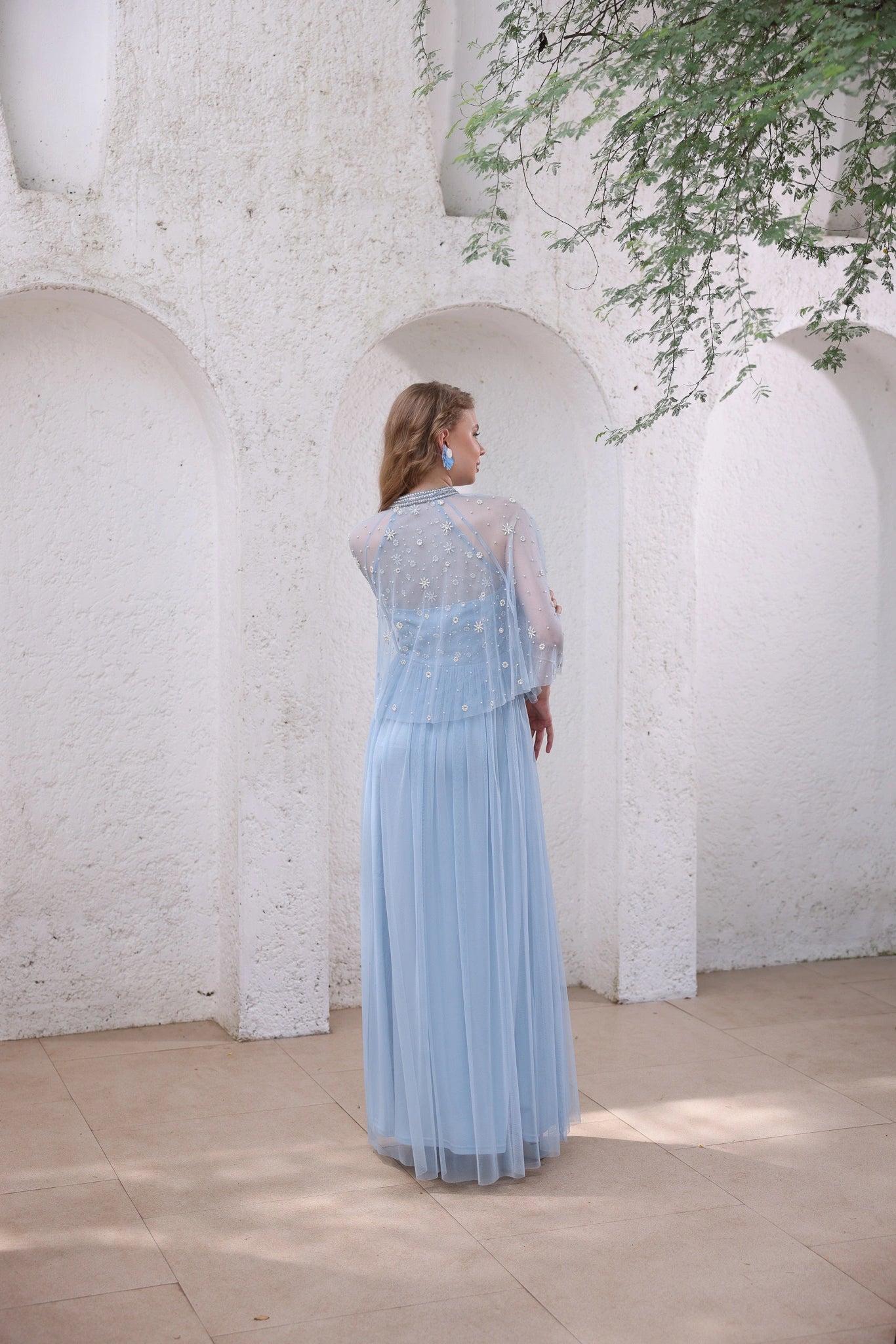 A delicate powder blue dress featuring hand-beaded floral motifs across the bodice, paired with a sheer tulle cape embroidered with dainty bead accents. The full-length dress is designed with a fluid fall that moves gracefully, while the detachable cape adds a touch of drama and versatility. An ethereal choice for festive celebrations, cocktail evenings, or destination weddings.