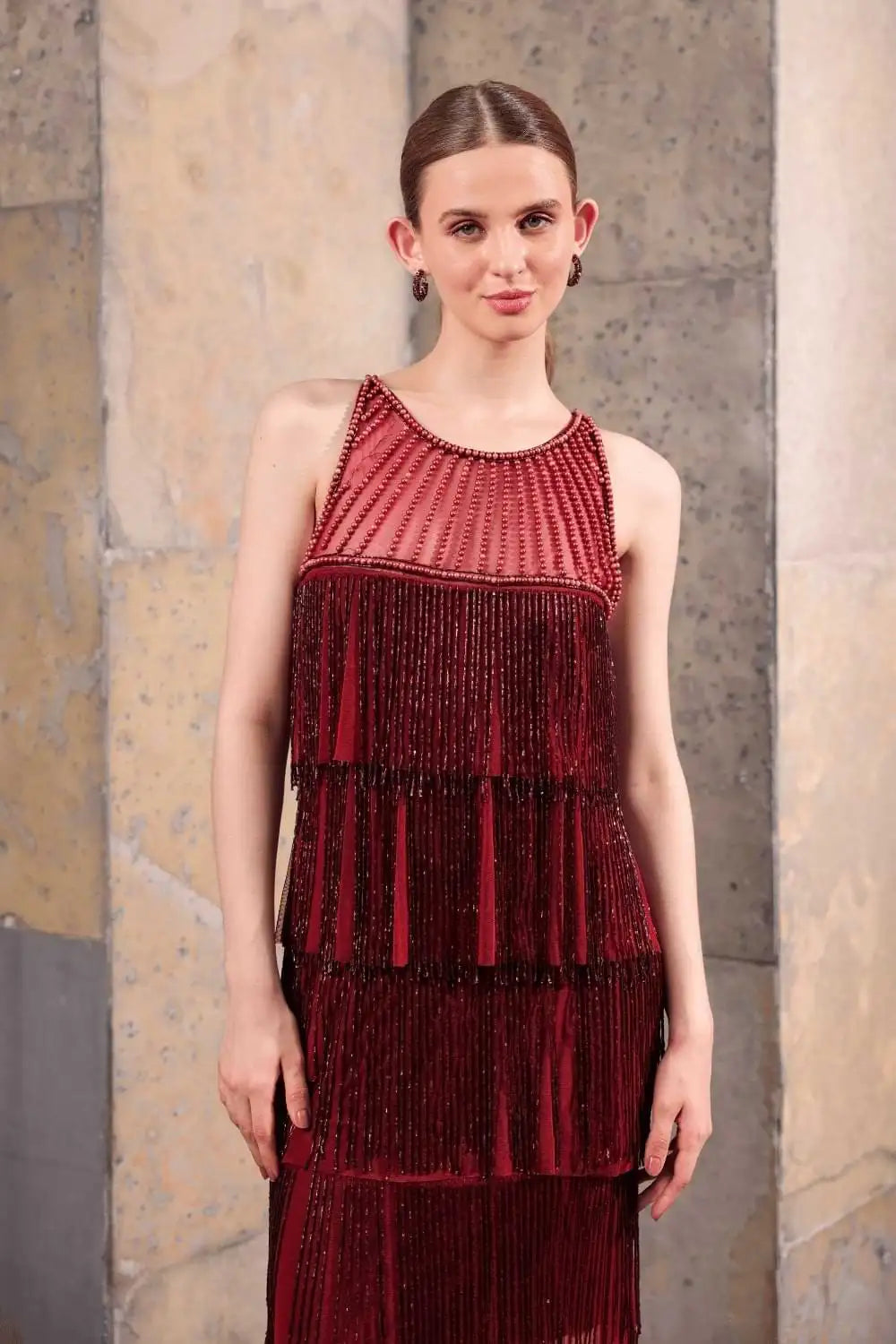 - Wine Hand-Beaded Fringe Dress